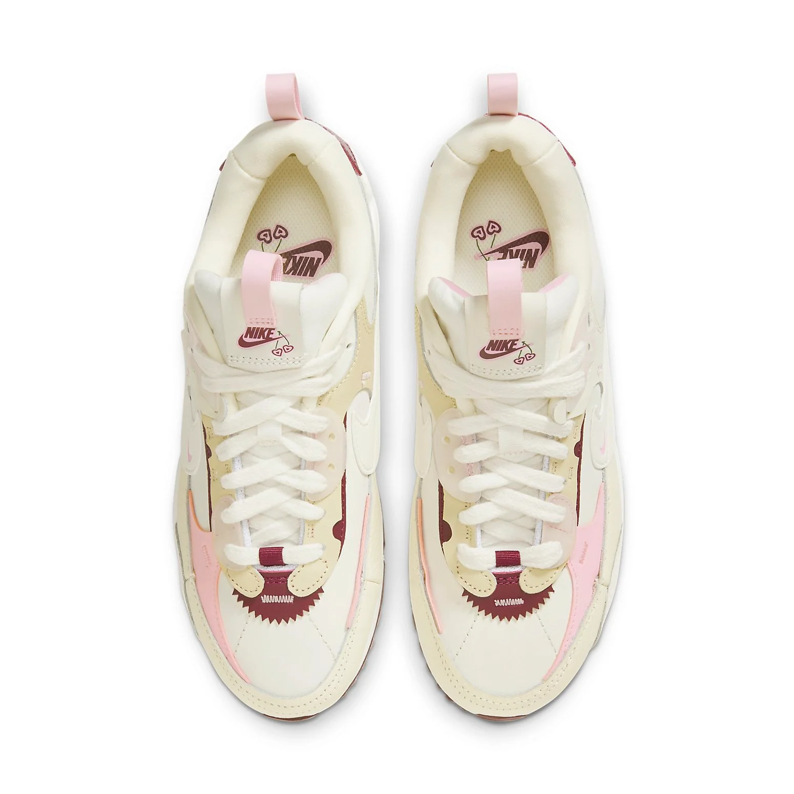 The Nithtke Air Max 90 Futura 'Valentine's Day' is a stylish sneaker designed to celebrate the special occasion. It features a mix of materials in a cream colorway, with pink and nightshade accents for a layered look. The sneaker is finished with dual pull-rings on the tongue and heel, a cherry blossom pattern on the tongue, a Sail mithtole, and a Maroon rubber outsole. Perfect for a night out or a casual day, this sneaker is sure to make a statement.